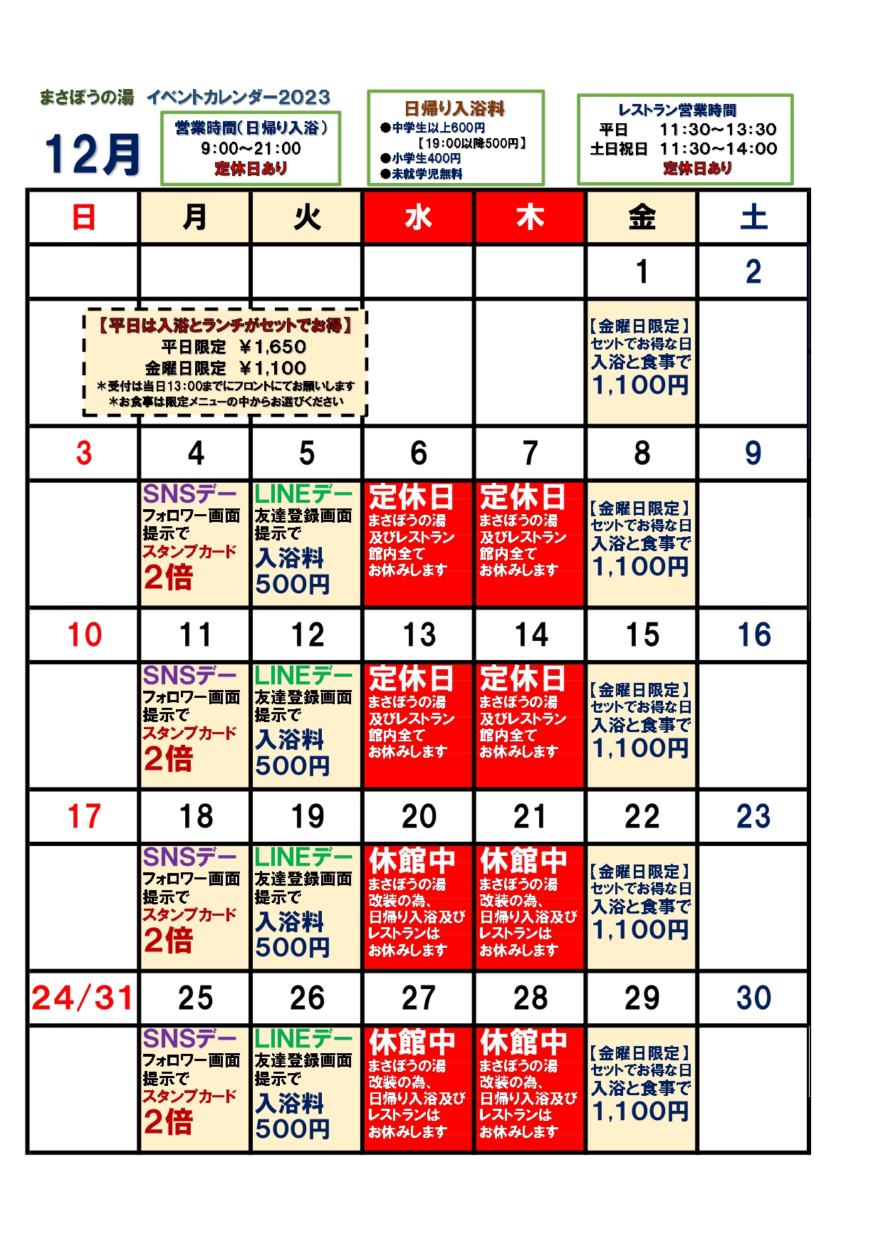 まさぼうの湯イベントカレンダー12月2023/12/02