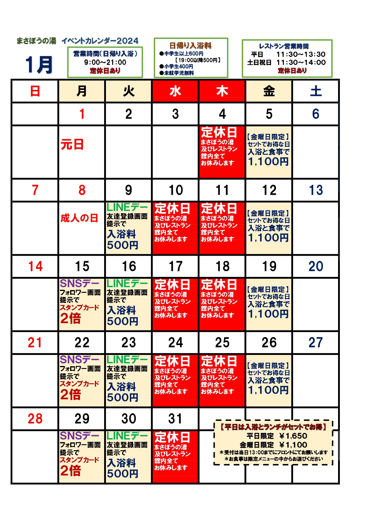 まさぼうの湯イベントカレンダー1月2024/01/02
