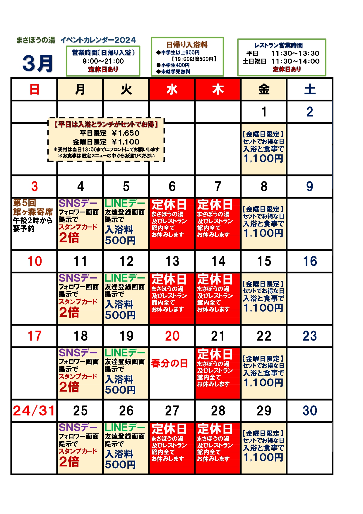 いつも館ヶ森高原ホテル・まさぼうの湯をご利用頂き誠にありがとうございます。3月のイベントカレンダーです。まだまだ雪のちらつく季節ではありますが皆様のご利用をスタッフ一同、心よりお待ち申し上げております。