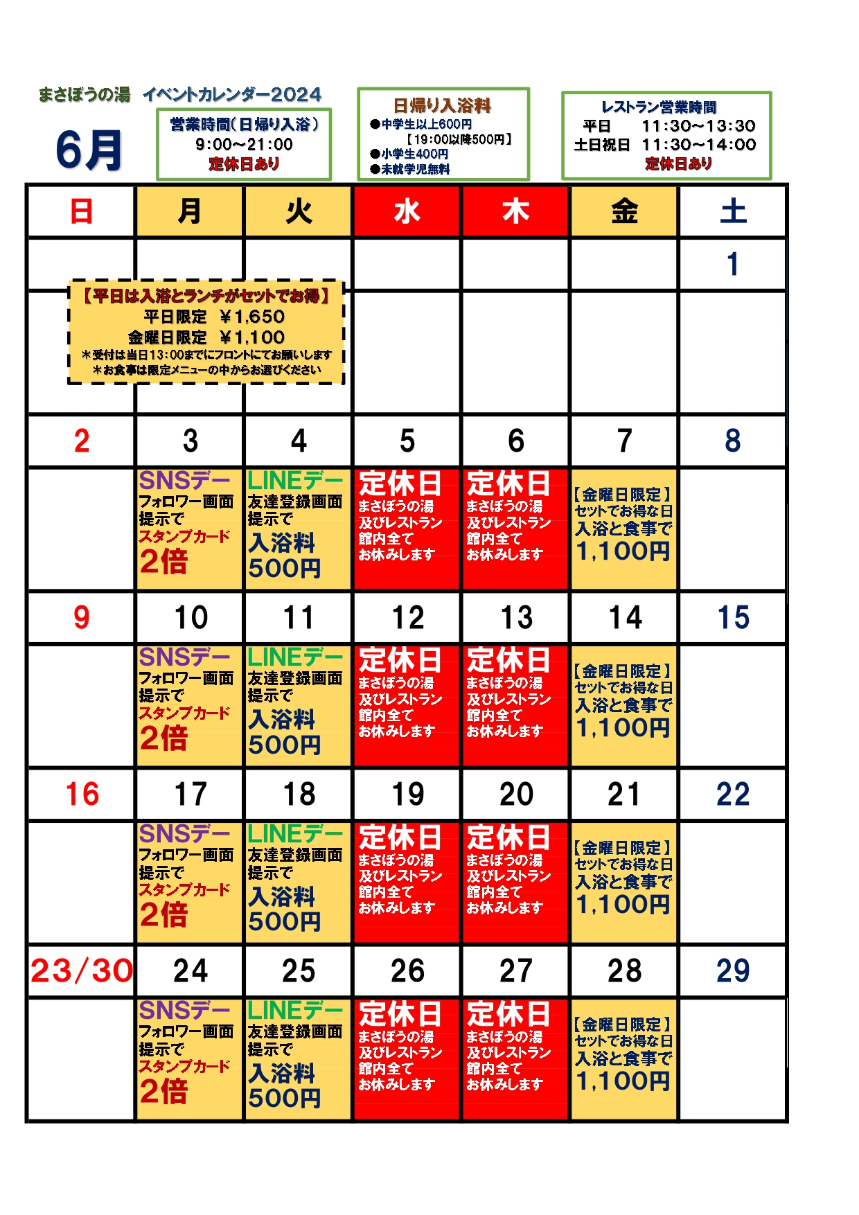 いつも館ヶ森高原ホテルのまさぼうの湯をご利用頂き誠にありがとうございます。6月の温泉イベントカレンダーを掲載致しました。農作業や草刈りなど疲れた体には温泉が一番です。この機会に準天然トロン温泉・まさぼうの湯を利用してみて下さい。ご利用をスタッフ一同、心よりお待ち申し上げております。