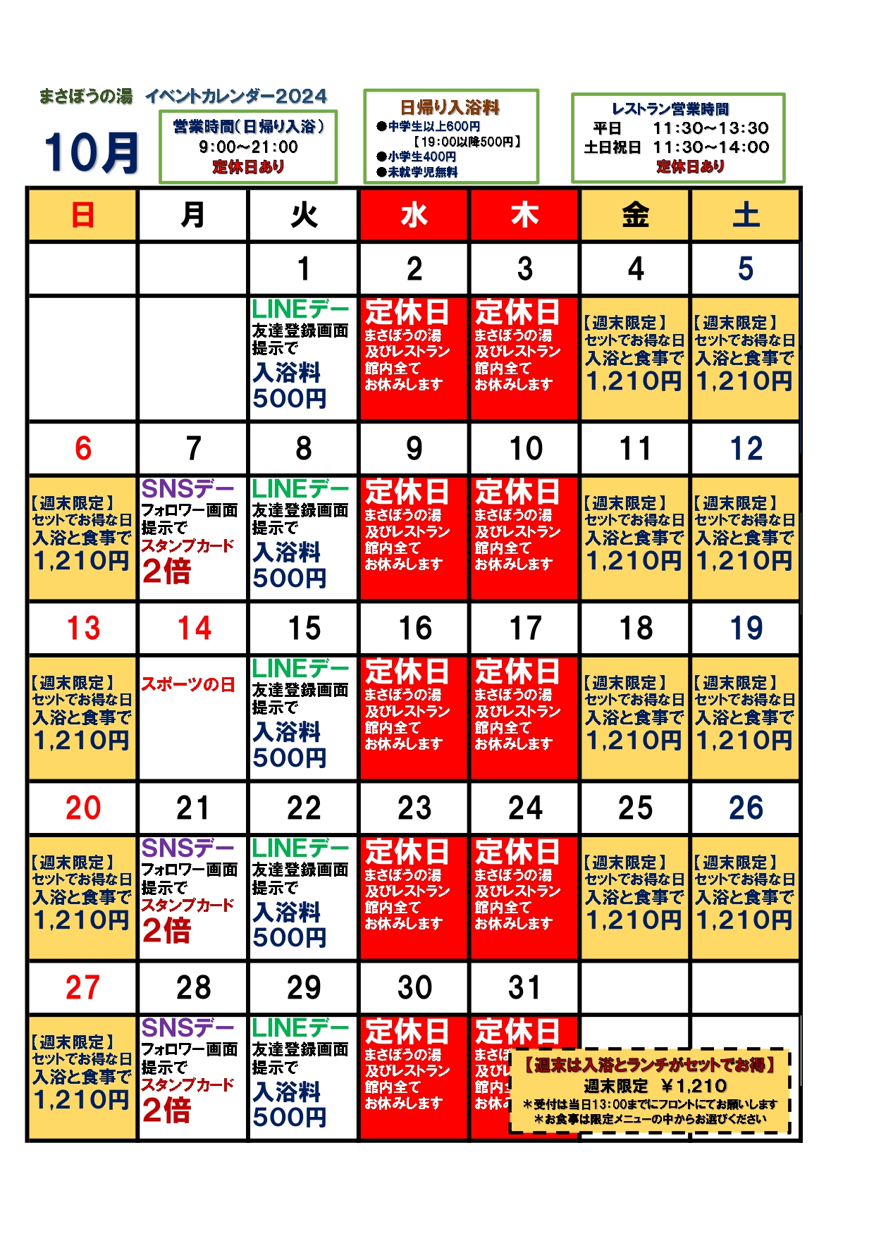 いつも館ヶ森高原ホテル・まさぼうの湯をご利用頂き誠にありがとうございます。暑い日があったり寒い日があったりと身体も疲れてしまいます。トロン温泉で新陳代謝を活発にしてリフレッシュしてみてはいかがでしょうか?10月のイベントカレンダーを掲載致しました。10月から始まる新しい企画もございます。皆様のご利用をスタッフ一同、心よりお待ち申し上げております。