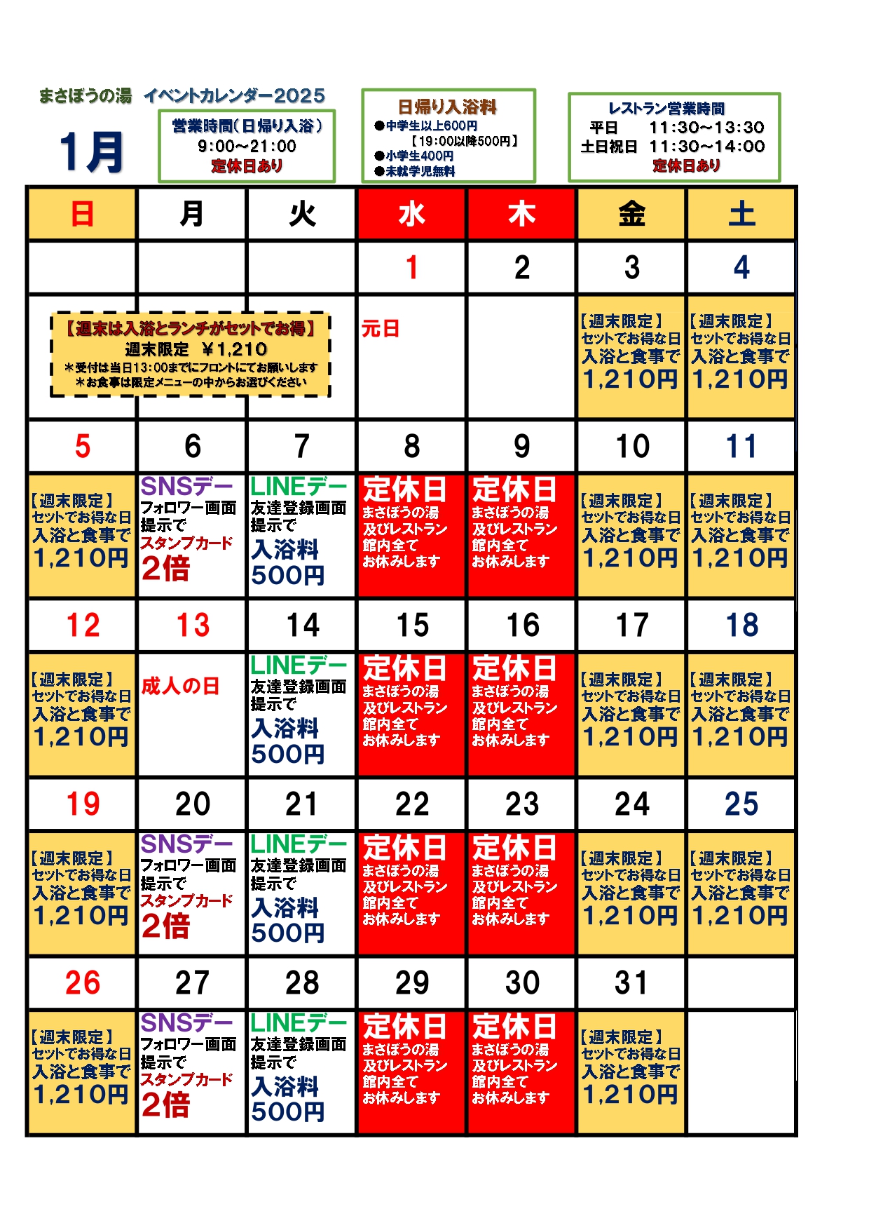 まさぼうの湯イベントカレンダー1月2025/01/01