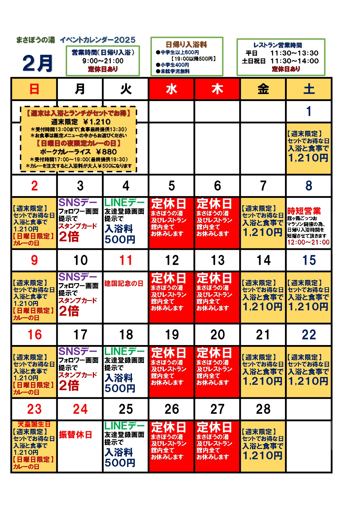 まさぼうの湯イベントカレンダー2月2025/01/28